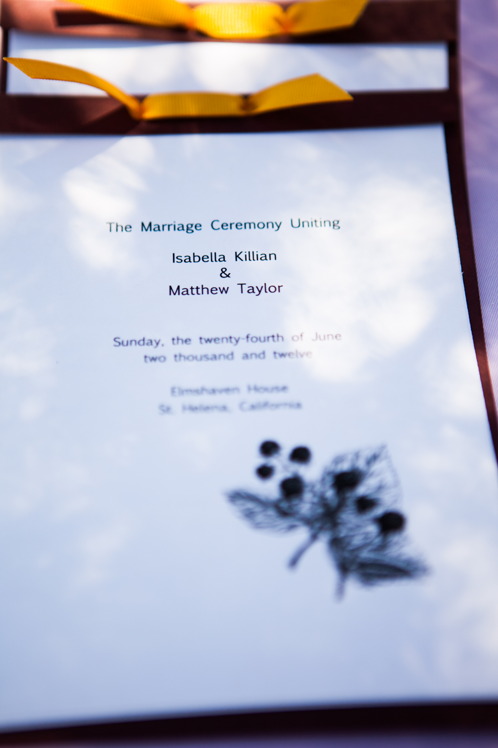 I took a guestbook from Michaels and replaced the ugly decoration with an engagement photo and some yellow grosgrain ribbon to match the programs.